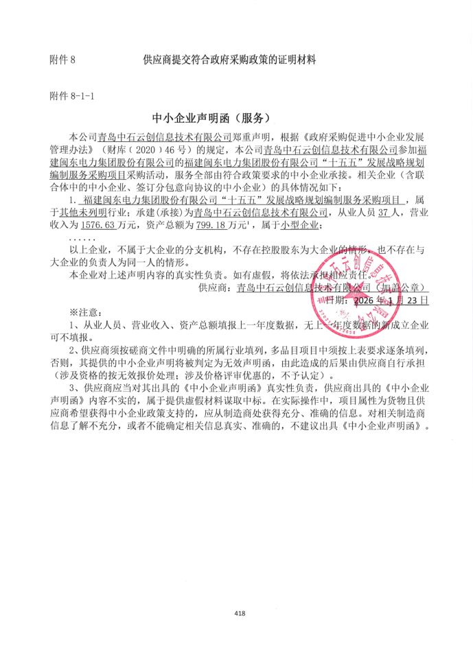1 | 青島中石云創(chuàng)信息技術(shù)有限公司 | 福建閩東電力集團(tuán)股份有限公司“十五五”發(fā)展戰(zhàn)略規(guī)劃編制服務(wù)采購(gòu)項(xiàng)目 | 福建閩東電力集團(tuán)股份有限公司“十五五”發(fā)展戰(zhàn)略規(guī)劃編制服務(wù)采購(gòu)項(xiàng)目 | 根據(jù)閩東電力“十四五”發(fā)展戰(zhàn)略規(guī)劃制定的主要任務(wù)完成情況進(jìn)行總結(jié)等,具體詳見(jiàn)成交供應(yīng)商響應(yīng)文件 | 2026年5月31日前通過(guò)采購(gòu)人組織的評(píng)審并提供正式報(bào)告,具體按磋商文件要求的時(shí)間節(jié)點(diǎn)執(zhí)行 | 成果以電子版和紙質(zhì)文本兩種形式交付等,具體詳見(jiàn)成交供應(yīng)商響應(yīng)文件 |
