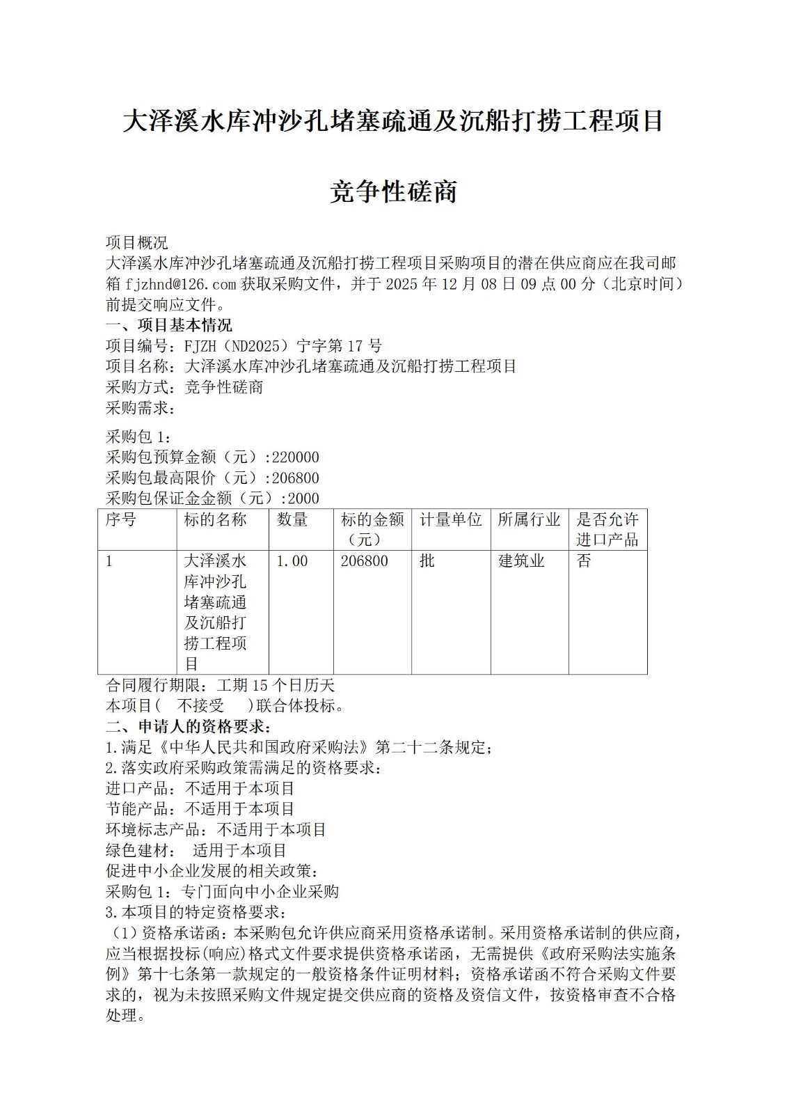 大澤溪水庫沖沙孔堵塞疏通及沉船打撈工程項目競爭性磋商